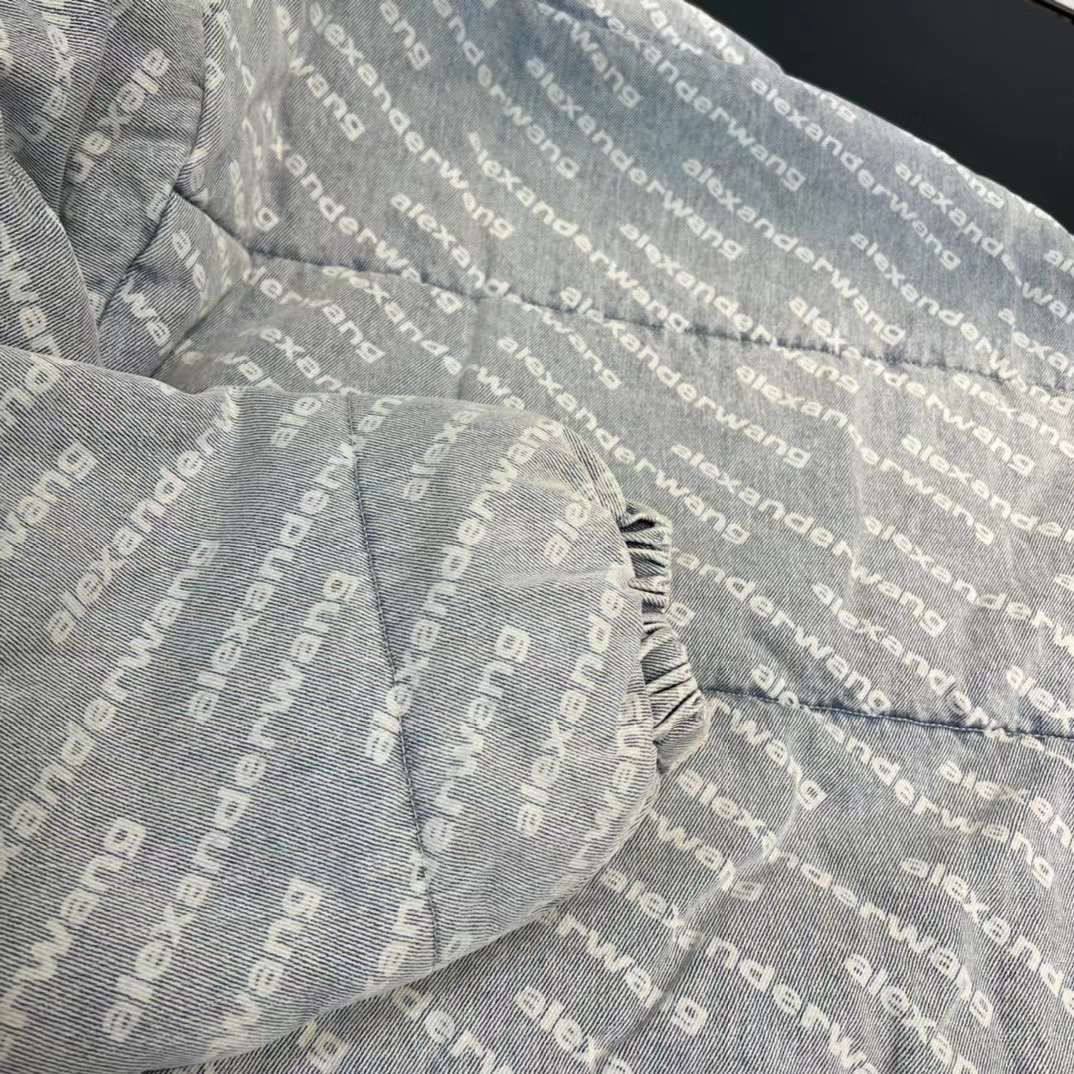 Long sleeve insulated non-stretch denim jacket from Alexander Wang brand, in blue color, featuring logo pattern printed in white.