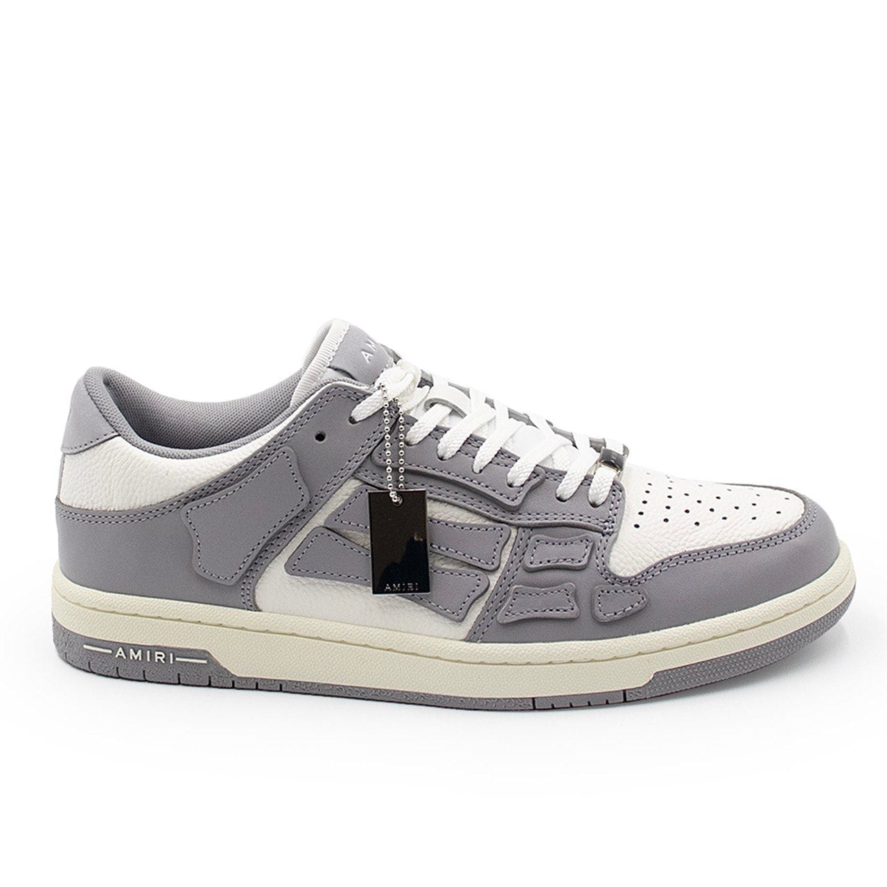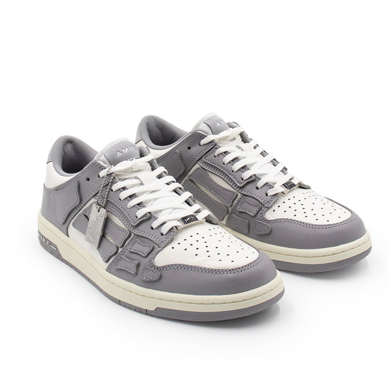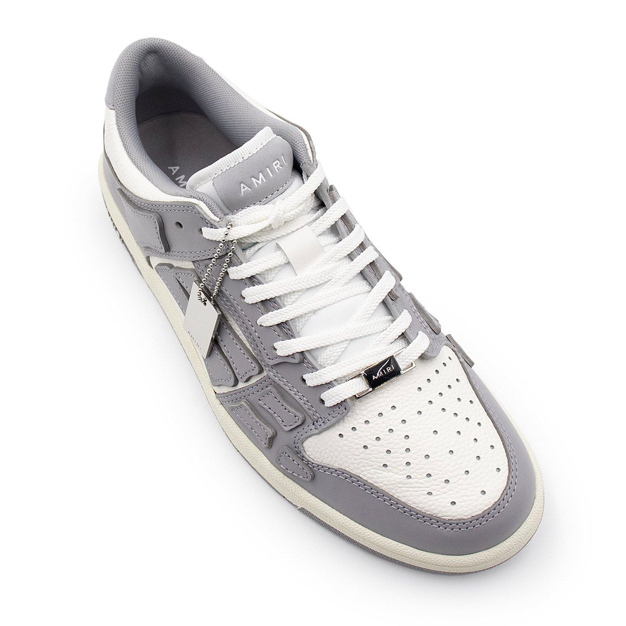 White and gray Skel Top Low trainers from Amiri brand is made of calf leather. Featuring a lace up closure with Amiri logo patch and silver Amiri lace detail, Amiri logo to the heel, Amiri logo to the side, Skeleton detail to the sides, ventilation eyelets at the toe and a rubber sole.
