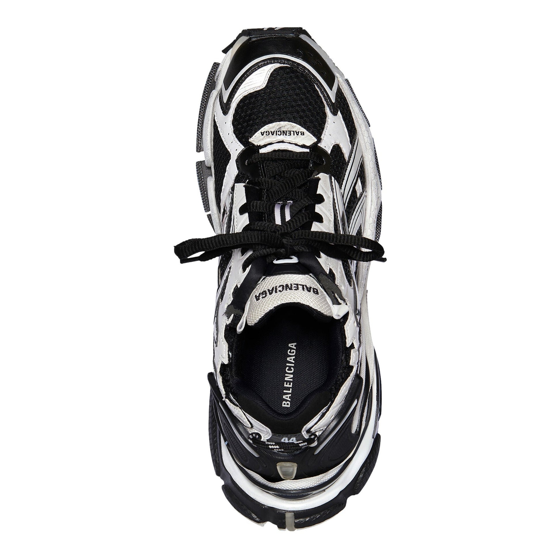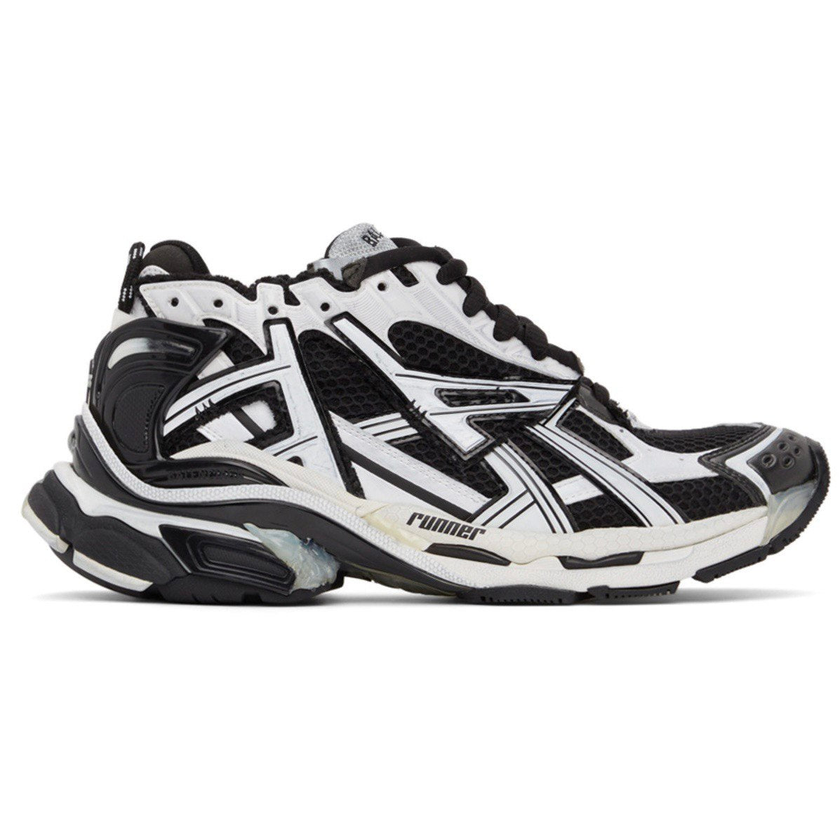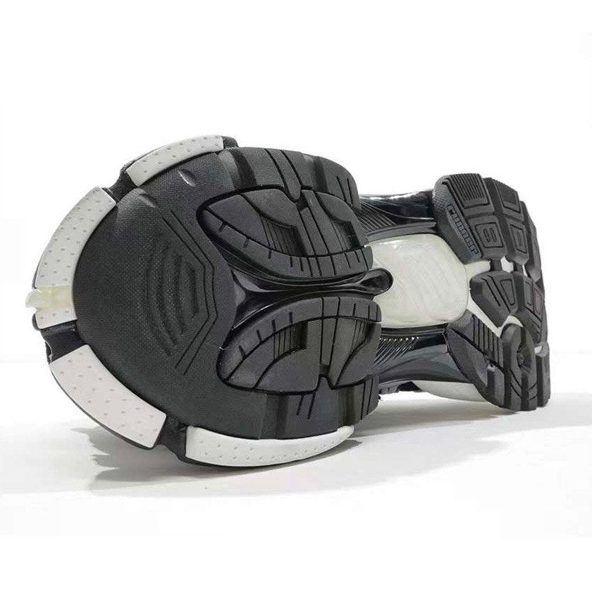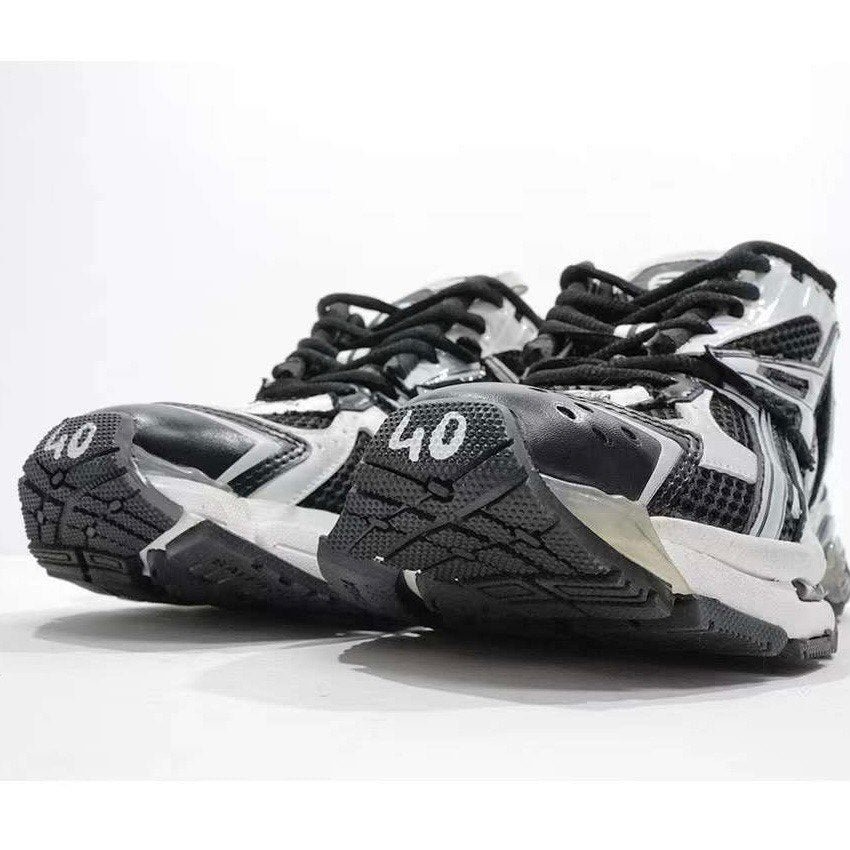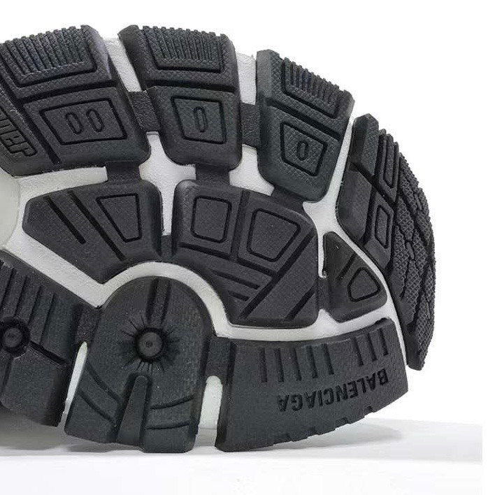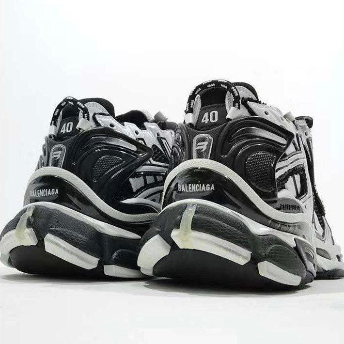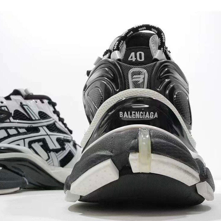 This black and white pair feature a stacked rubber sole, a nostalgic reference to retro running shoes.