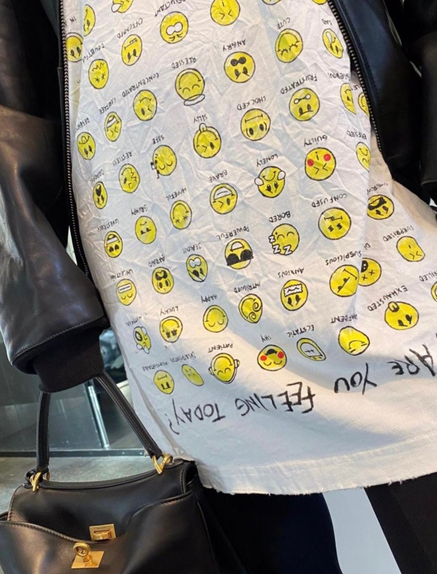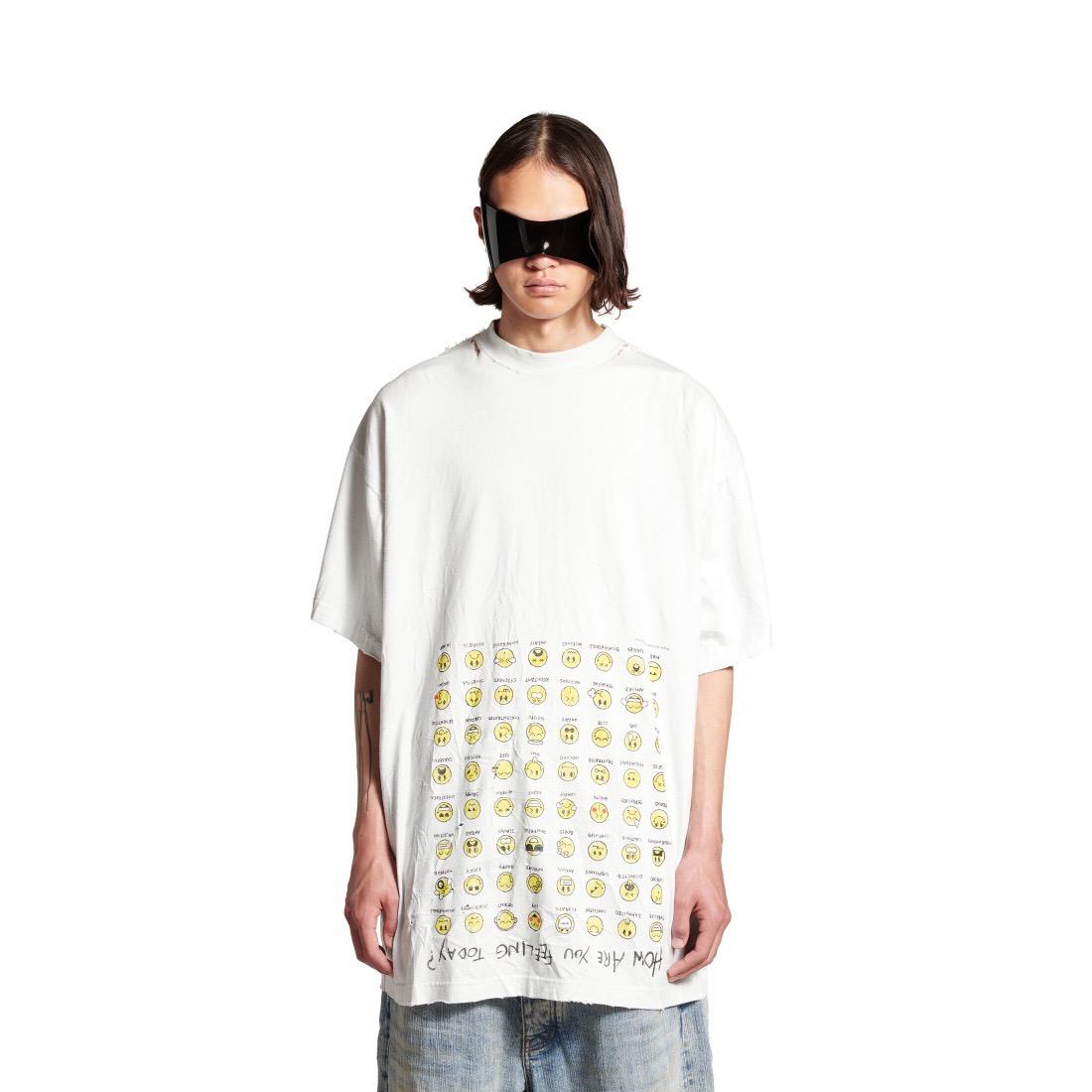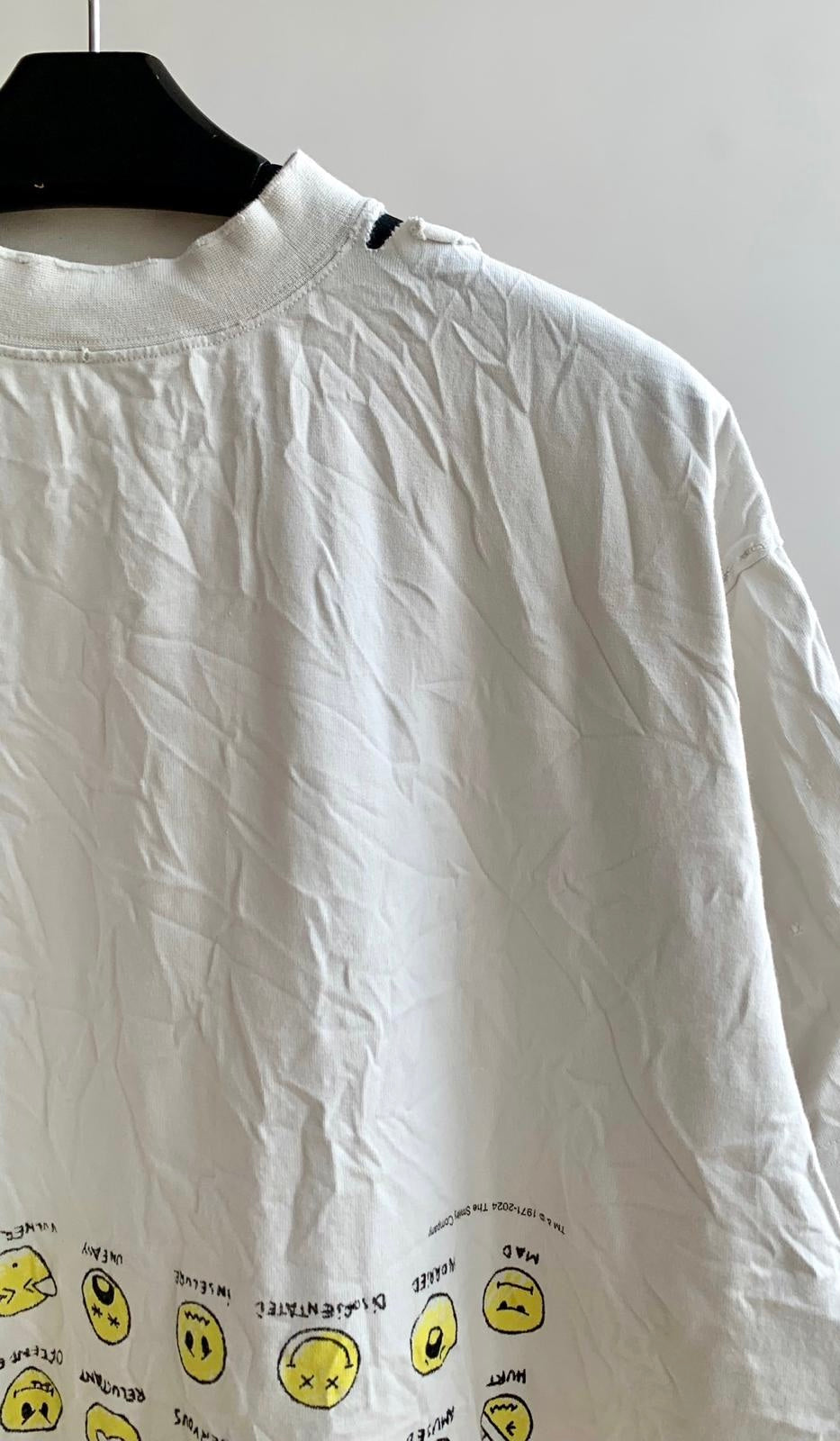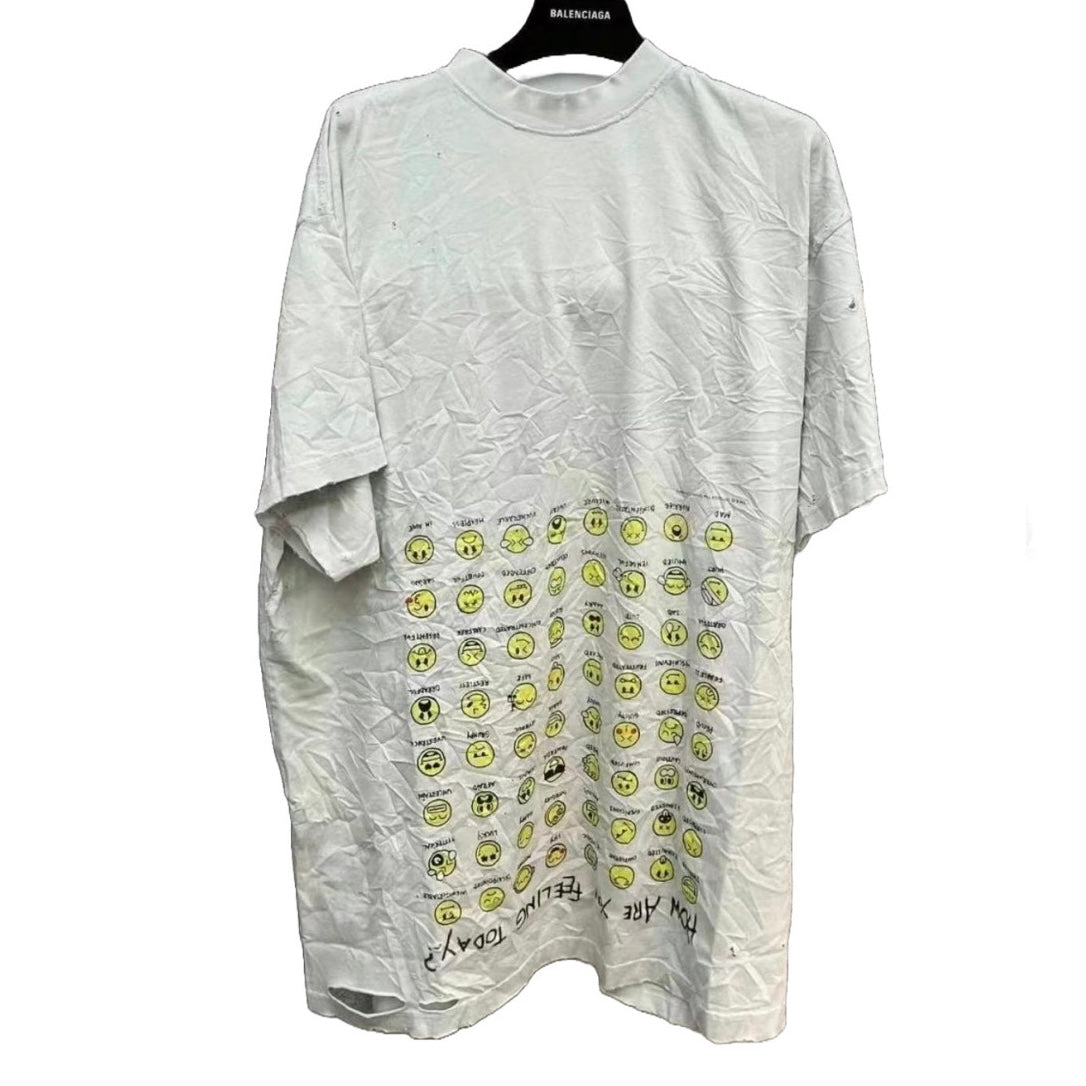 The Balenciaga Vintage Effect T-shirt is a bold statement piece. Crafted from premium cotton, this oversized tee offers unparalleled comfort and a relaxed fit. Its unique design features a playful print of yellow emoticons with captions like "SLEEPY" and "HAPPY," alongside the question "HOW ARE YOU FEELING TODAY?"