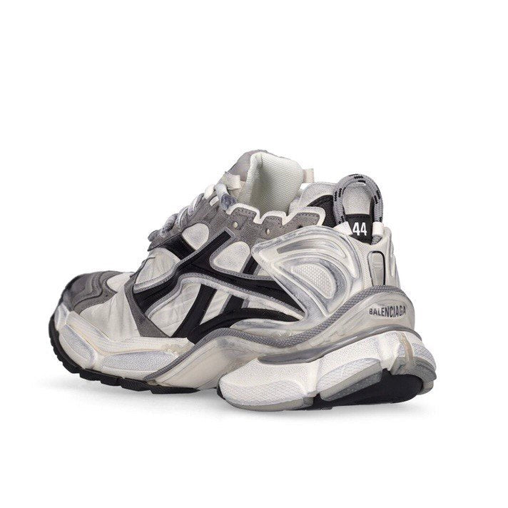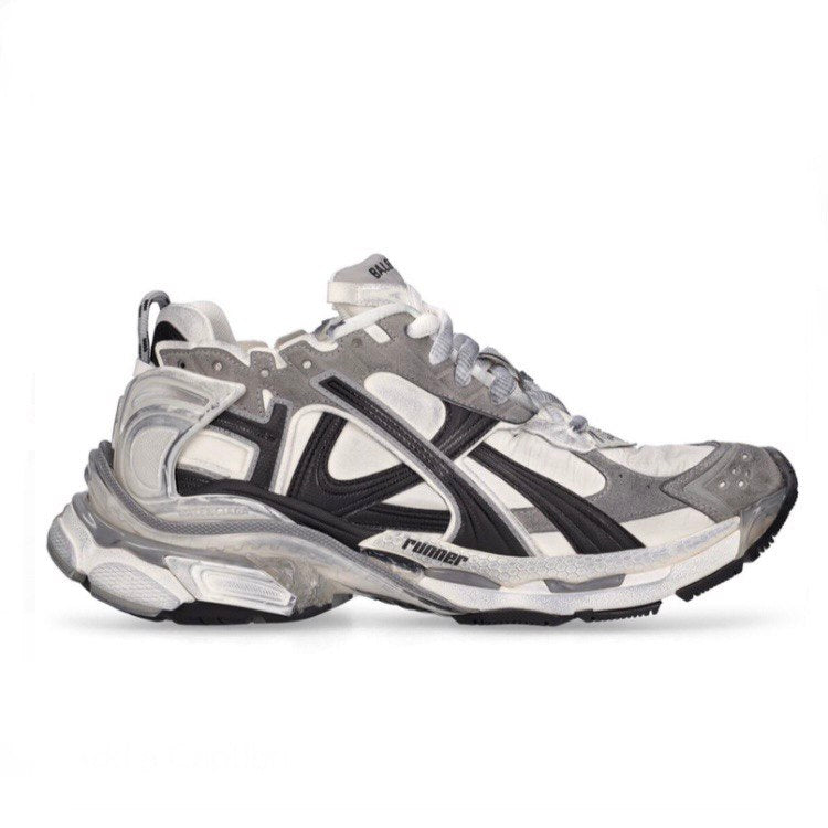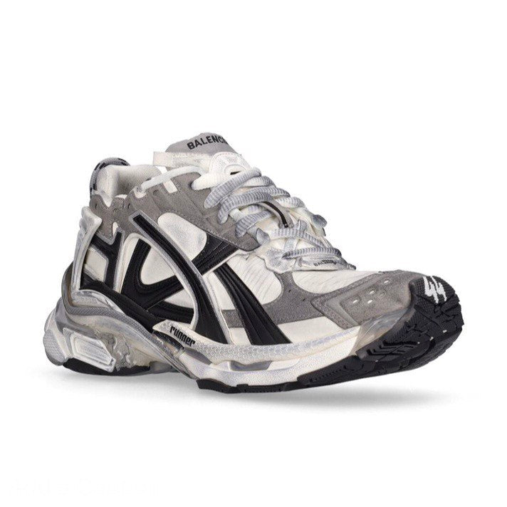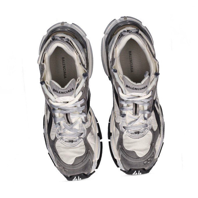 Designed with a modern and sleek paneled design, these BALENCIAGA White Runner sneakers are a must-have for any sneaker enthusiast. Constructed with high-quality faux leather materials, they provide durability and style. The logo-print tongue and front lace-up fastening add a touch of branding while the chunky rubber sole offers comfort and traction. Stay in style and step up your sneaker game with BALENCIAGA.