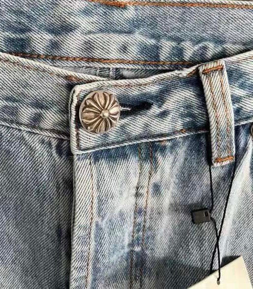 Blue Chrome Hearts denim jeans with black leather cross patch.
