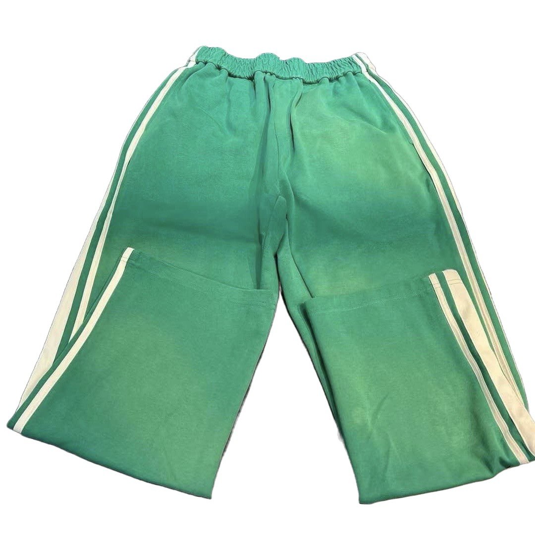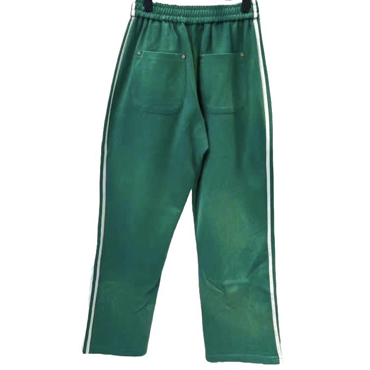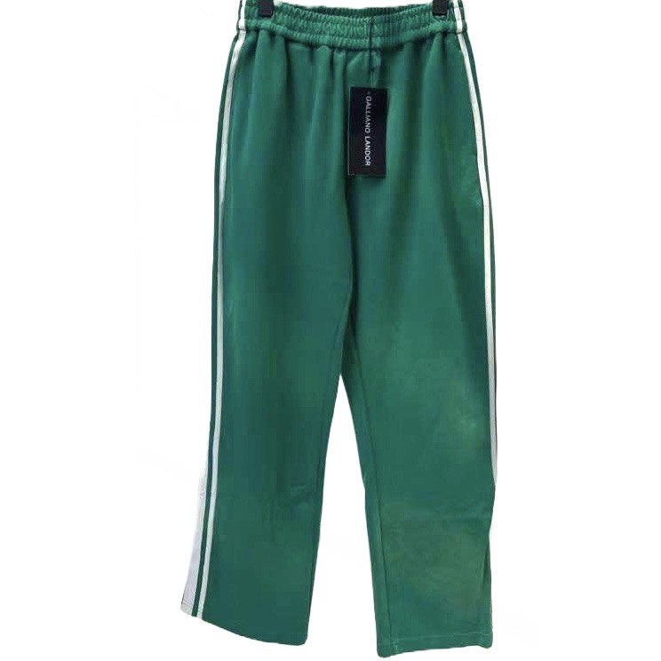 Elevate your wardrobe with Galliano's Aqua Green Sunfade Stripe Trousers. Through the use of a sunfade retro wash process, these trousers achieve a unique, faded appearance. With their white stripe patchwork detailing, these trousers are sure to make a stylish statement.