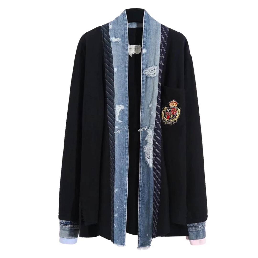 An unique and classic jacket made by Greg Lauren. A combination makes the jacket of cotton and wool. The majority portion of the jacket is in black, but it is still considered to be a multi-colored jacket. The middle part of the jacket is in classic jeans color with a ripped off jeans texture as well.