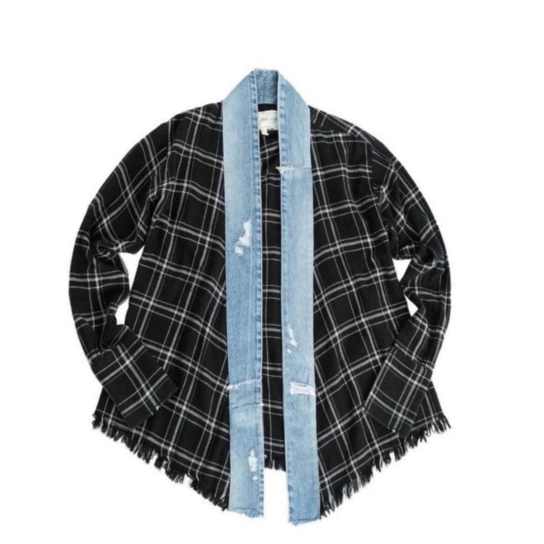 An unique and classic jacket made by Greg Lauren. A combination makes the jacket of cotton and wool. The majority portion of the jacket is in black and grey. The middle part of the jacket is in classic jeans color with a ripped off jeans texture as well.