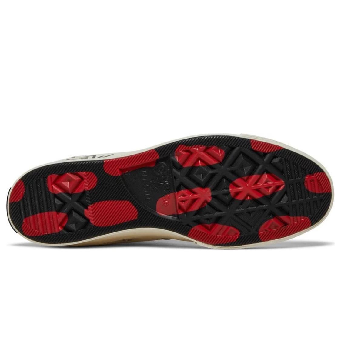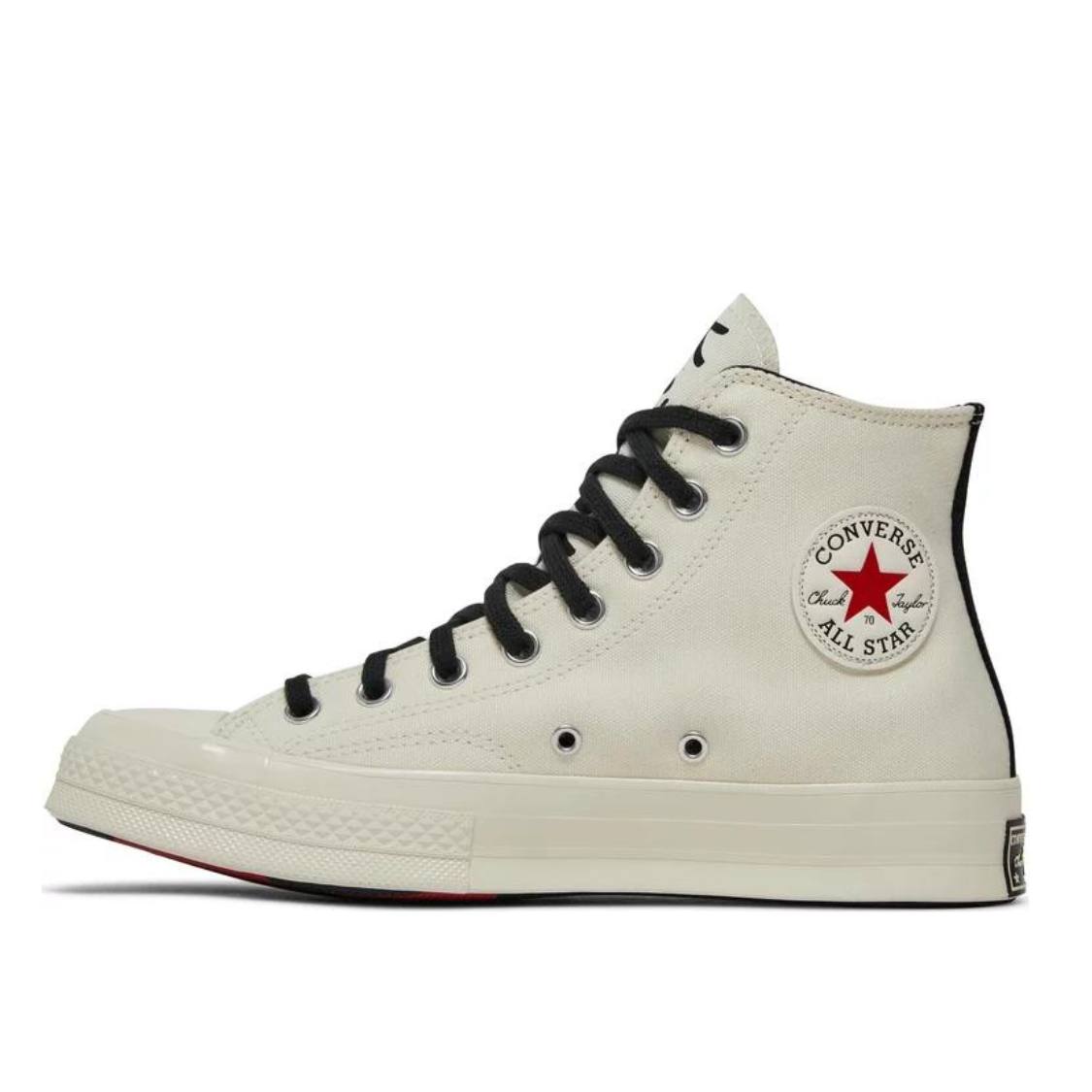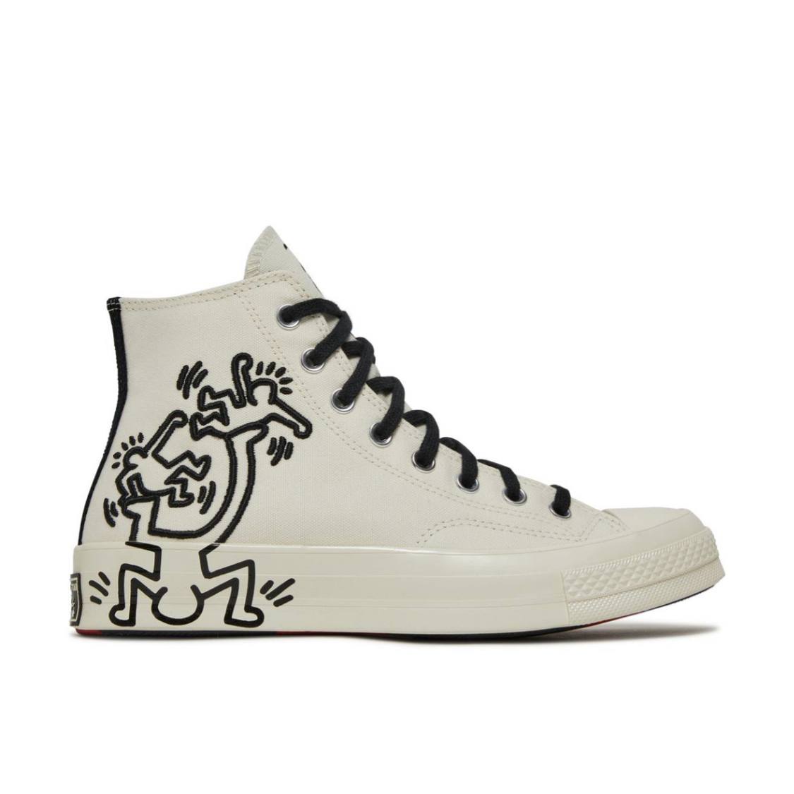 Sneakers are built with organic canvas, the shoe's upper appears in white, highlighted by Keith Haring's dancing figures in a black embroidered fashion on the lateral side, continuing down onto the midsole.