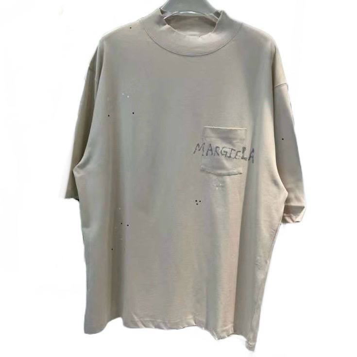Upgrade your wardrobe with the MAISON MARGIELA Beige Logo T-Shirt. Made from high-quality cotton, this crewneck t-shirt features a unique washed effect and fake vernis stains for added style. The loose fit and high ribbed collar add a touch of comfort to this statement piece. Complete with a logo print on the chest pocket, this t-shirt is perfect for those looking for a modern and edgy look.