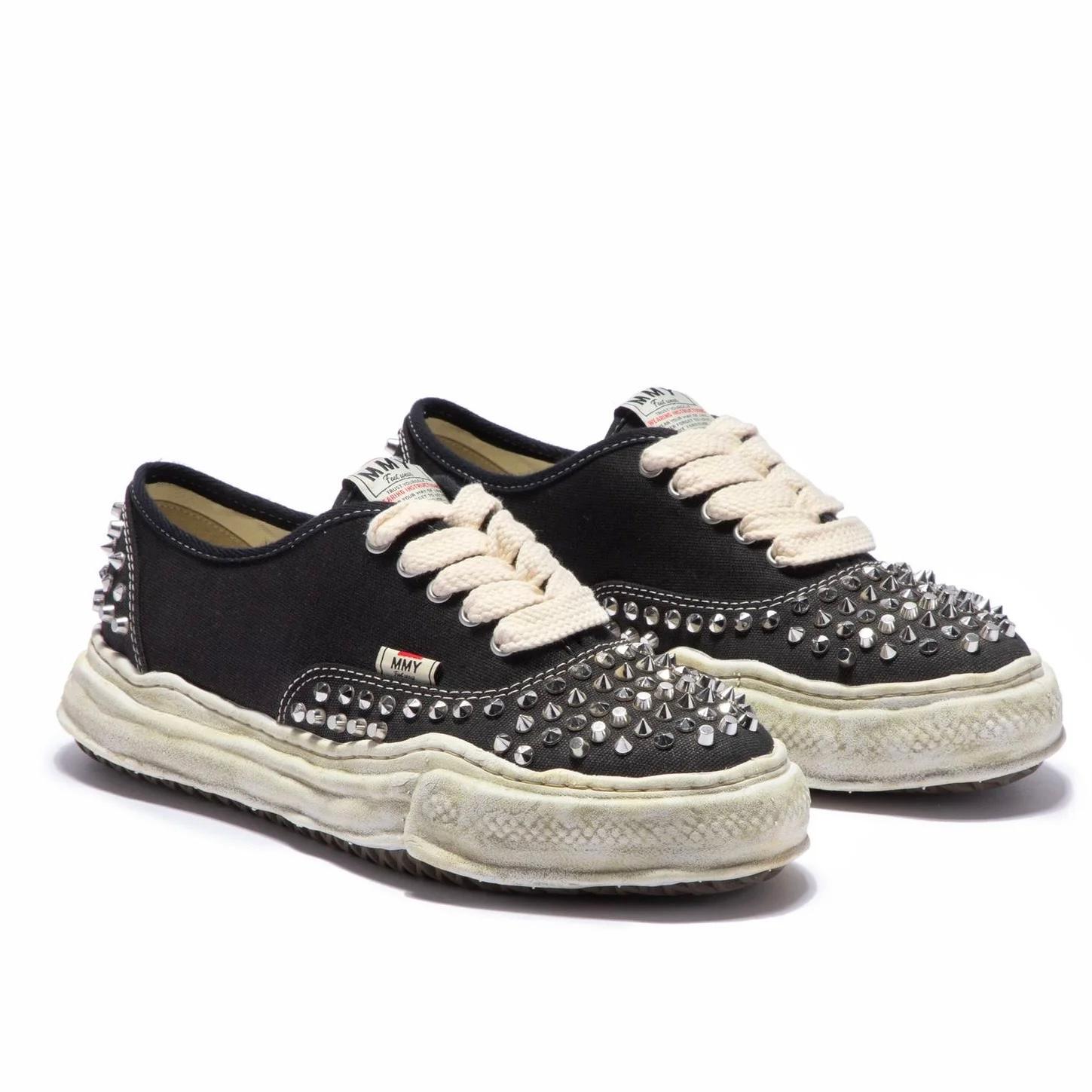 Mihara Yasuhiro Baker Sneakers in black canvas. These sneakers feature a panelled design, front lace-up fastening, stud detailing, contrast stitching, a logo patch at the tongue, a rubber toecap, and a branded insole with a rubber sole.