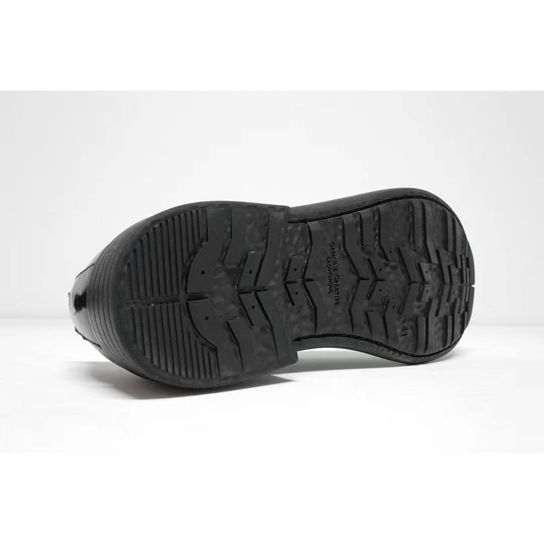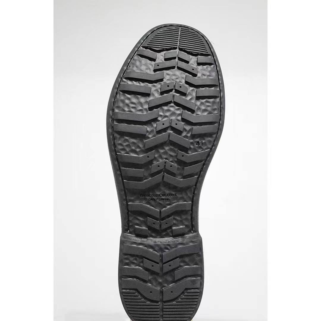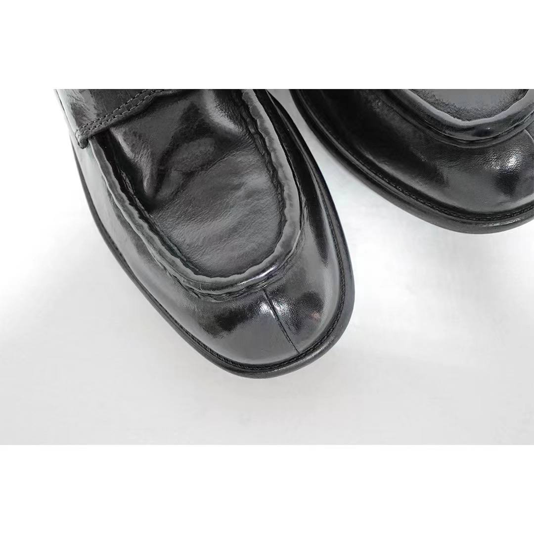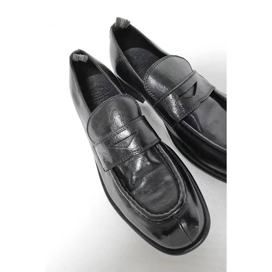 Black buffalo leather and calf leather Arc loafers from Officine Creative featuring a round toe, a branded insole, a pull tab at the rear and a chunky low heel.