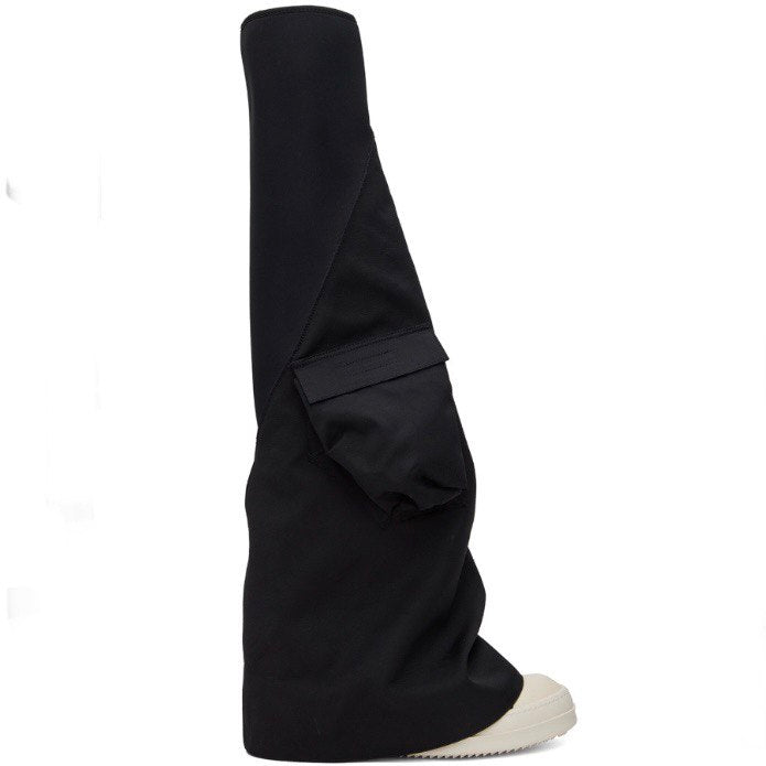 Elevate your footwear game with RICK OWENS DRKSHDW Women Cargo Fetish Knee High Boots. These knee-length boots feature a unique design including a contrasting toe, side flap pocket, and insert design. The round toe and flat rubber sole provide both style and comfort. Made with high-quality materials, including 100% fabric and calf leather lining, these boots are a must-have for any fashion-forward individual.