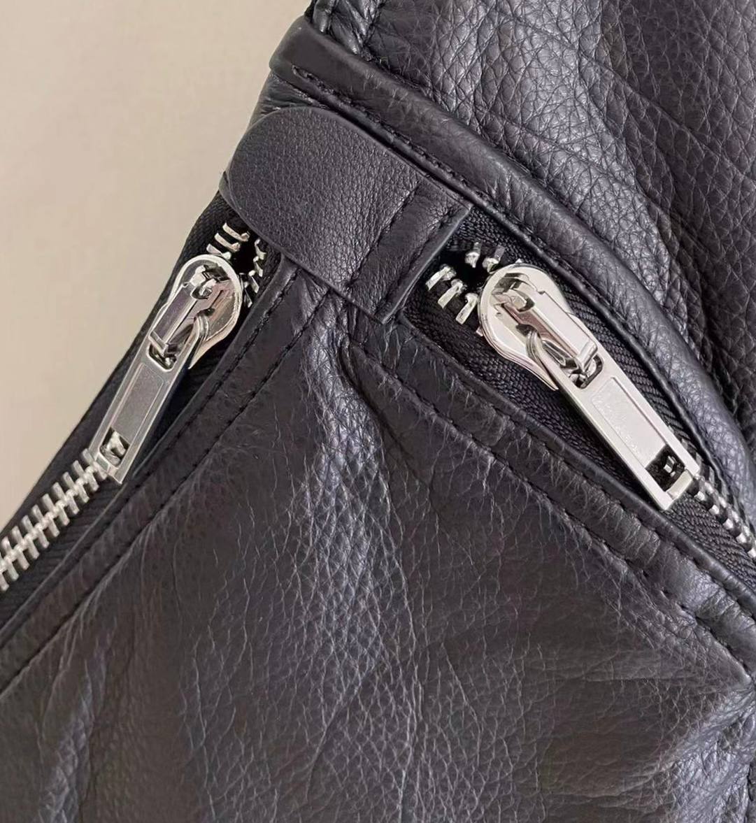 the Bauhaus Leather Vest features two shoulder straps, an open-front waistcoat style and two large cargo pockets with silver-tone hardware.