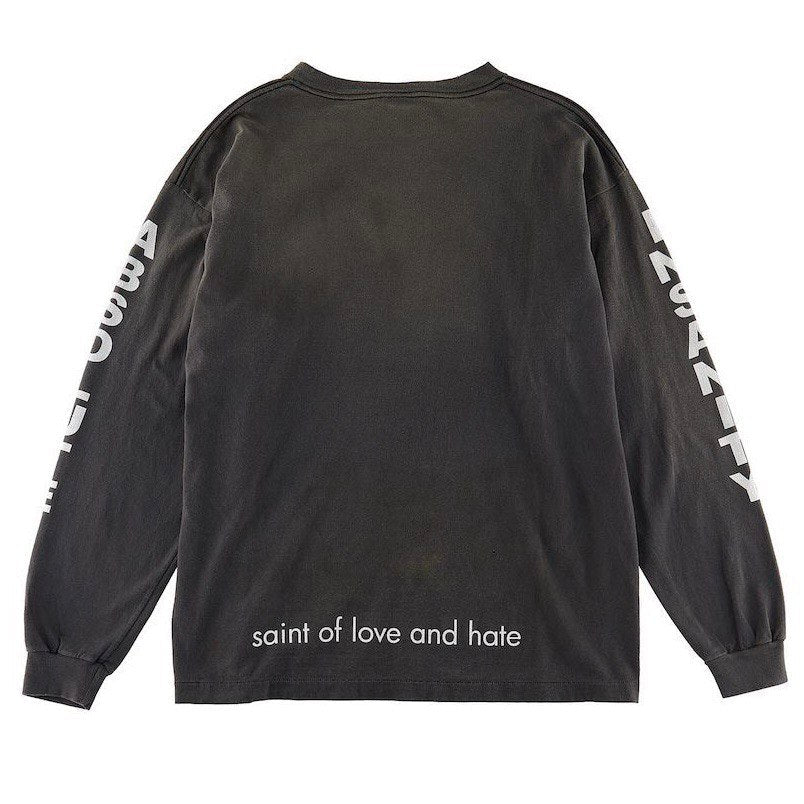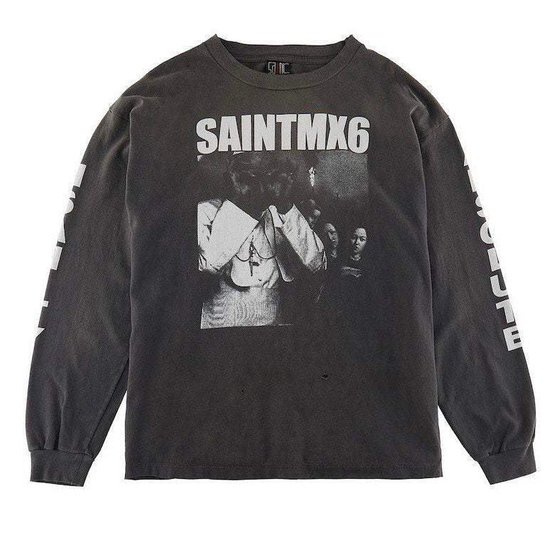 The SAINT MICHAEL Graphic-Print Long-Sleeve T-Shirt. Crafted from a cotton-blend fabric, it boasts an eye-catching logo print to the front, graphic-print sleeves, and a slogan print to the rear. The classic crew neck and long sleeves