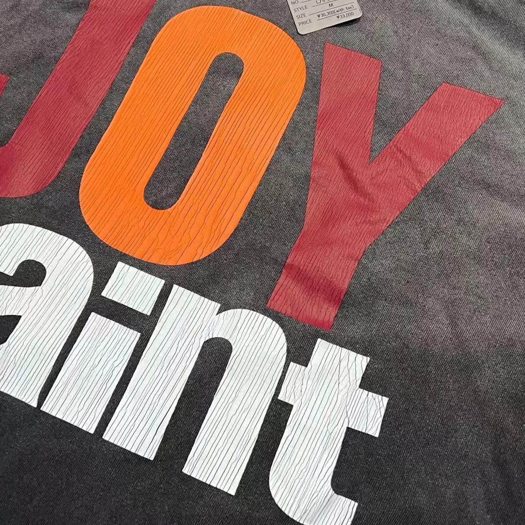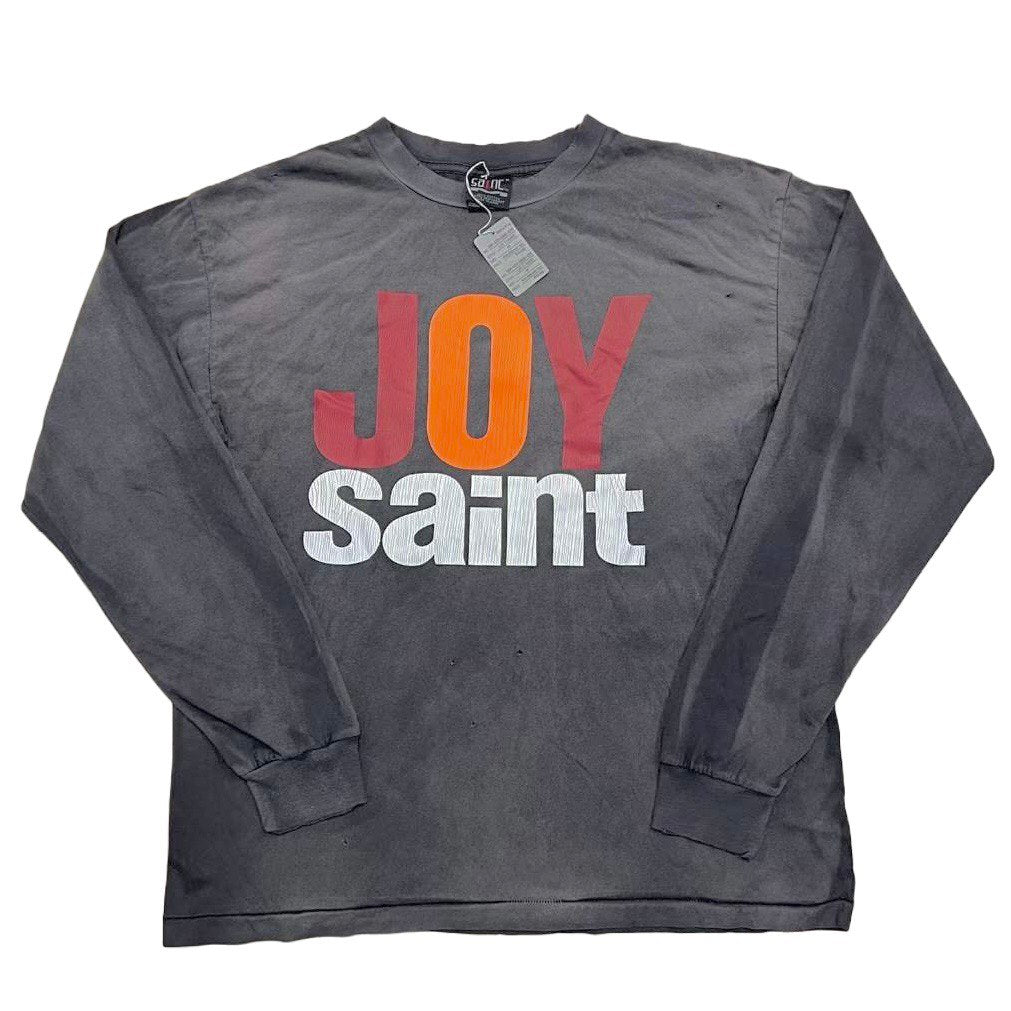 The vintage-treated silhouette features sprinted and phrasing "Joy Saint" at the front and print on the back.