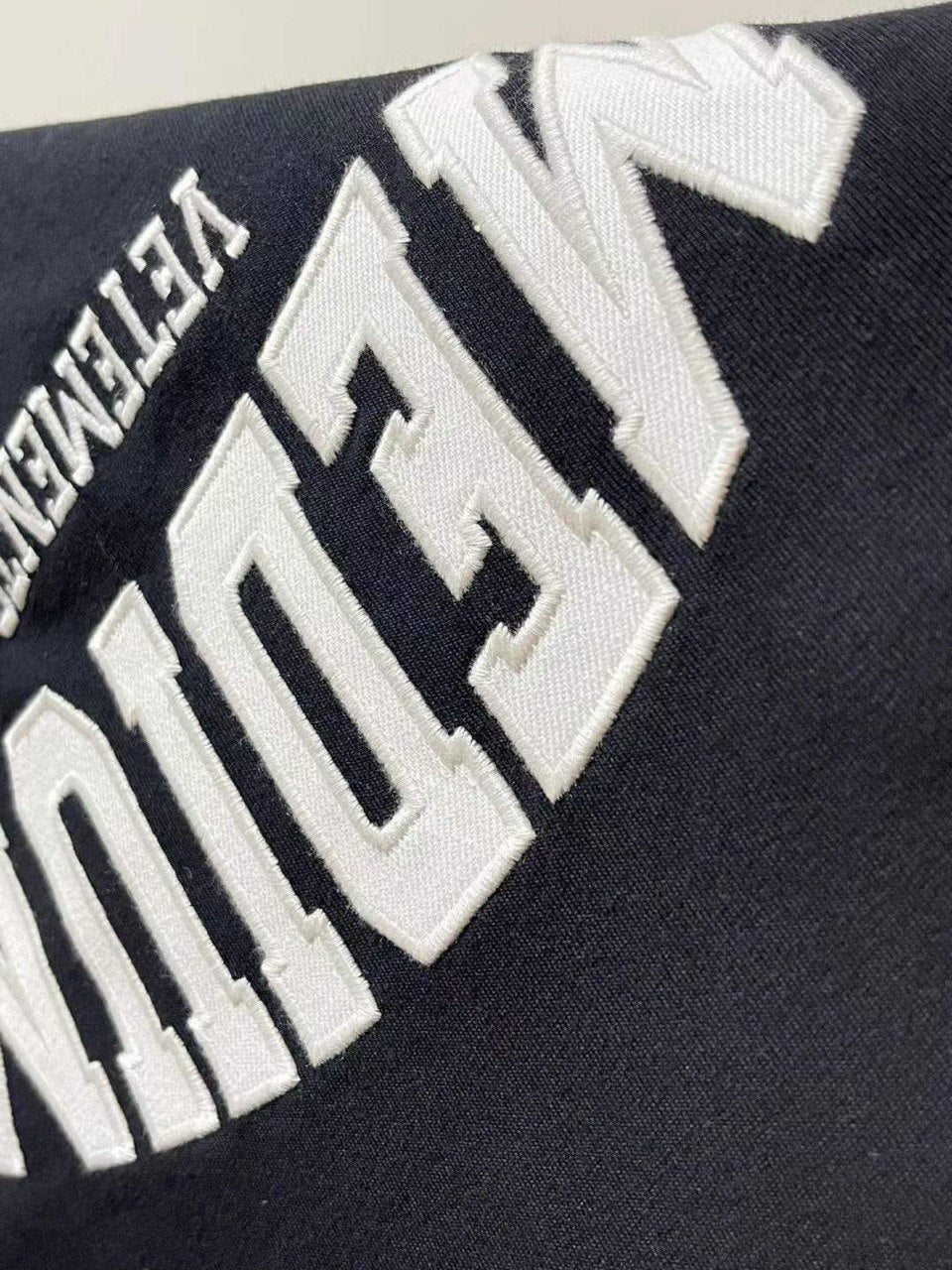 This VETEMENTS medium black cotton t-shirt is crafted with ribbed crewneck, short sleeves, and a straight hem for a comfortable fit. It features a white 'medium' logo embroidery on the front, along with a tone-on-tone embroidered logo at the back. Enjoy the classic style and comfortable fit of this timeless t-shirt.